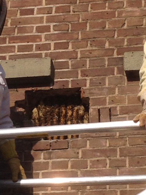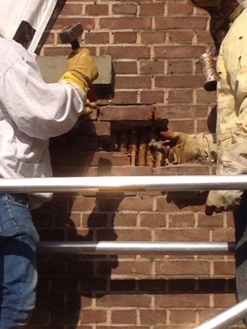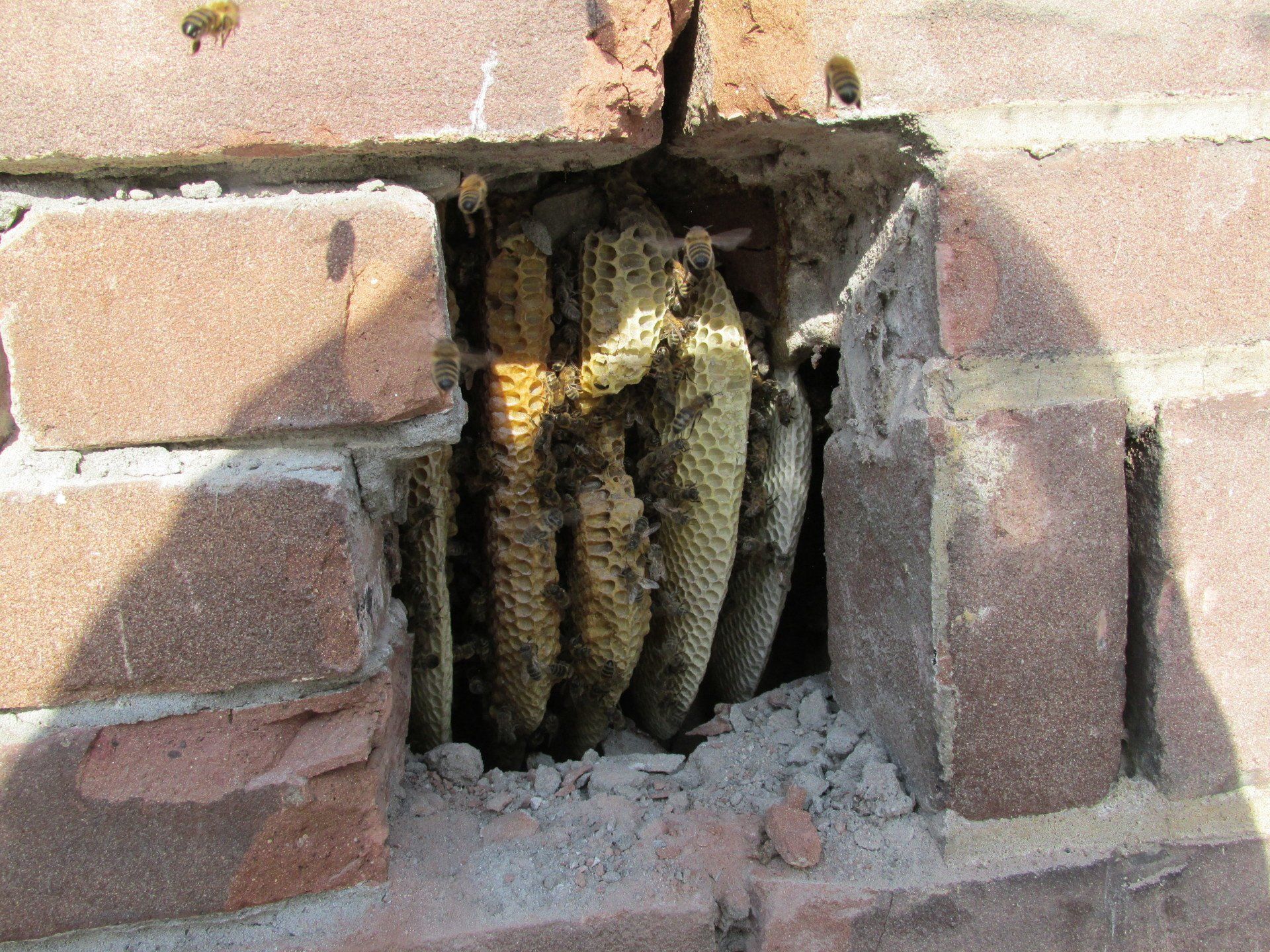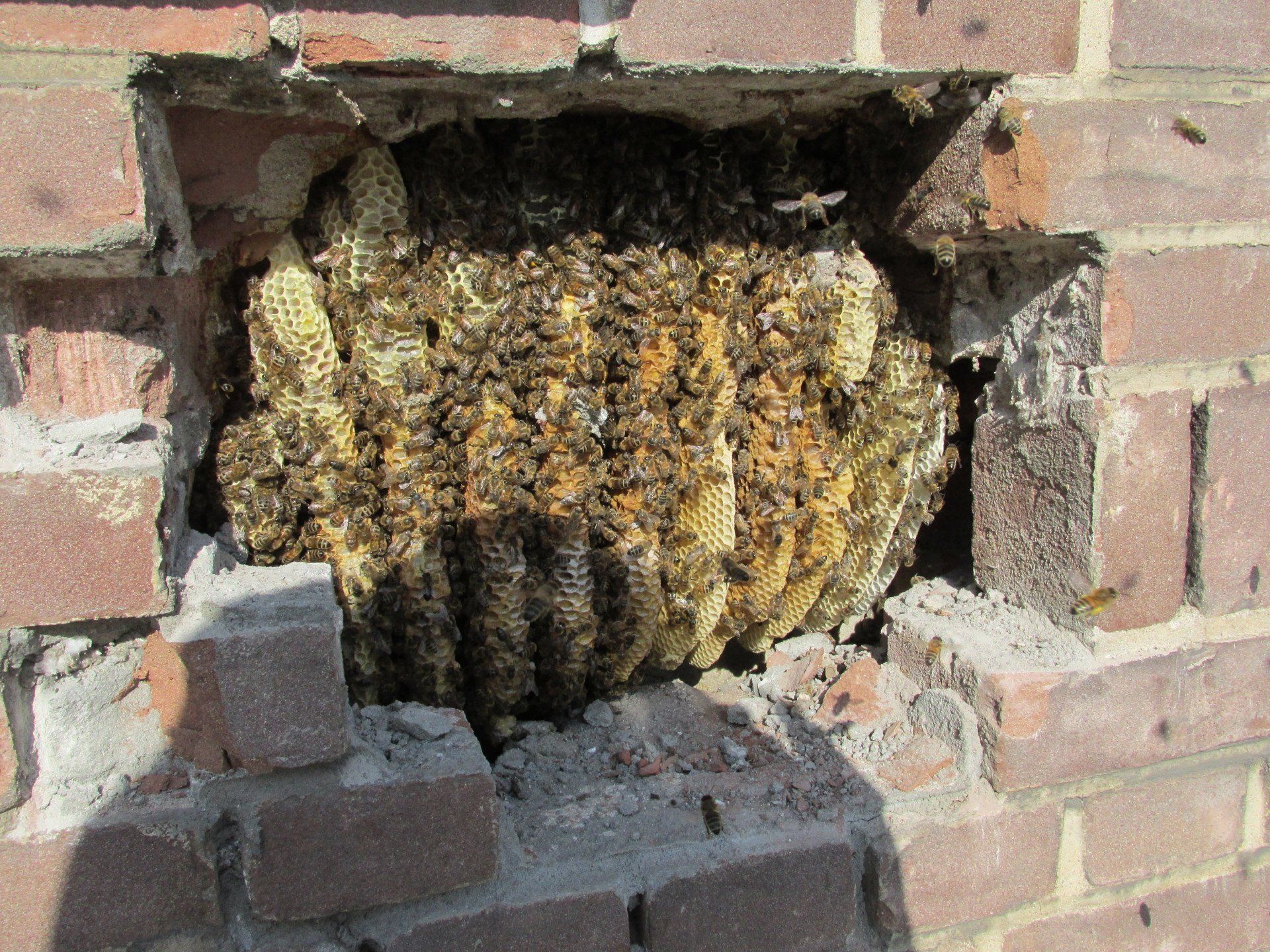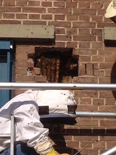 Wat is het geval: Er zit een bijenvolk in de muur op het binnenplein en ze willen dat het wordt verwijderd. Saver was al gebeld ,maar omdat bijen beschermd zijn hebben zij niets ondernomen. Of wij een oplossing weten. Jawel maar dan moeten we wel de stenen uit de muur halen. Dat was GEEN probleem.