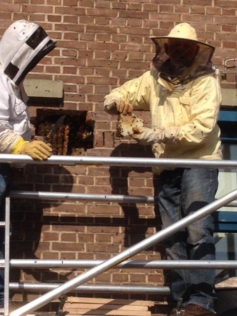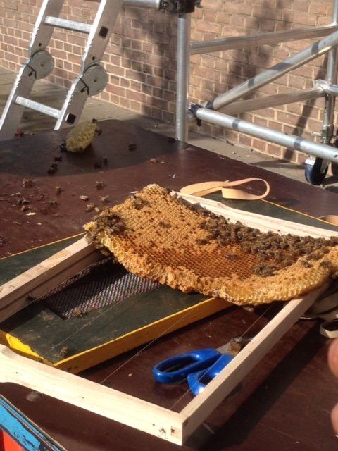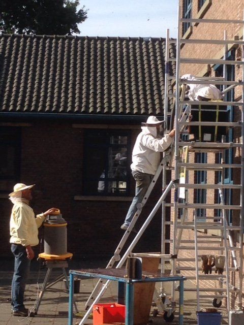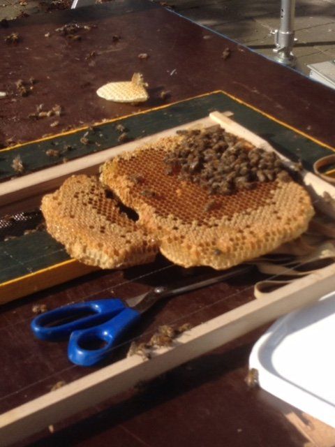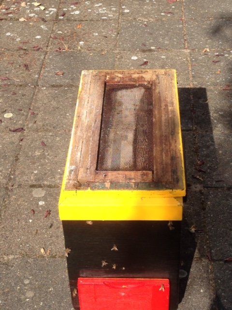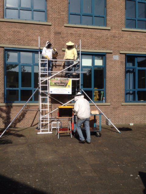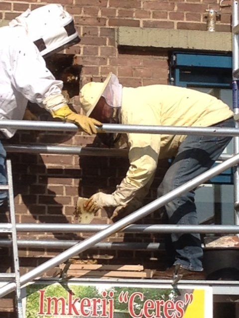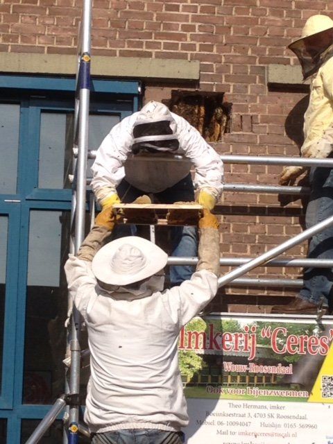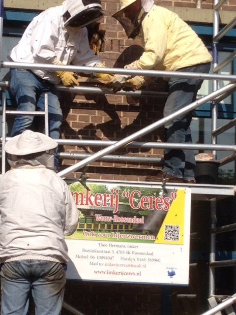 Vanmorgen samen met collega imkers Aad de Graaf en Piet van Eekelen met succes het bijenvolk dat was neergestreken in een muur van het Norbertuscollege in Roosendaal verhuist naar een bijenkast