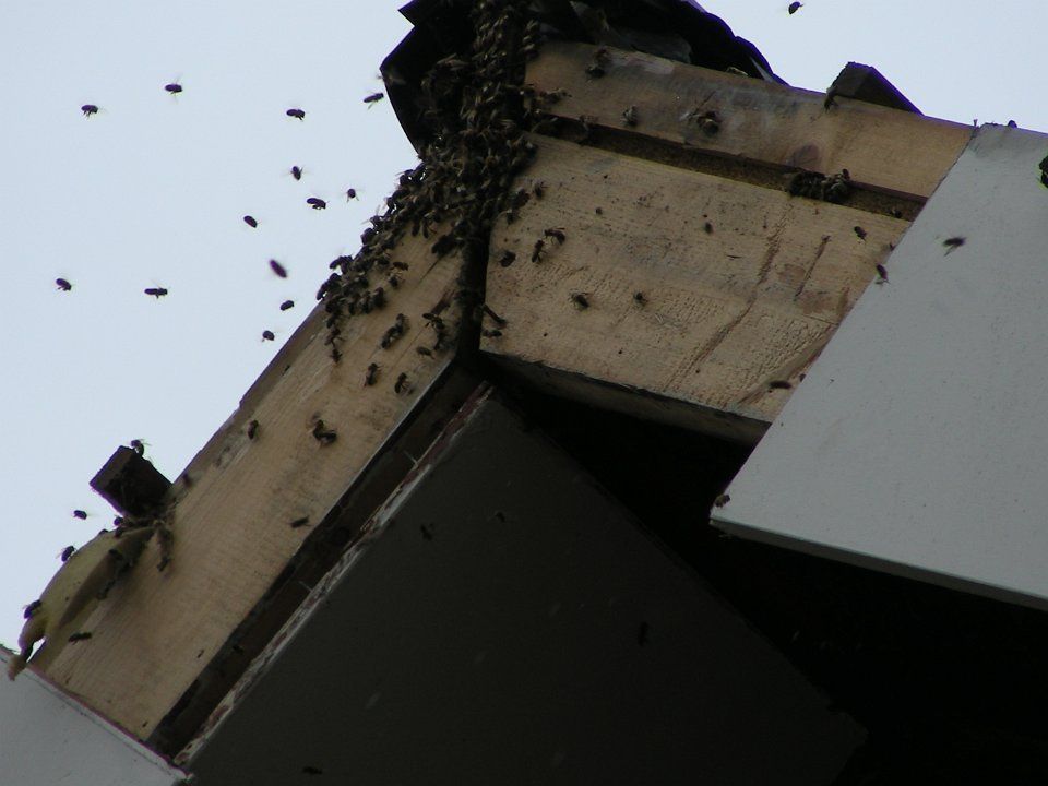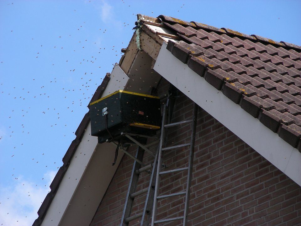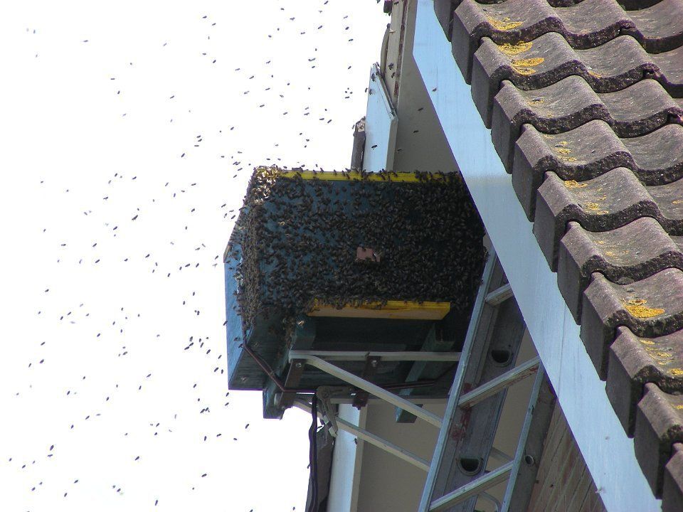 Het was een spectaculair gezicht om de bijen die waren achtergebleven in de nok te zien vervliegen naar de kast op de ladder.